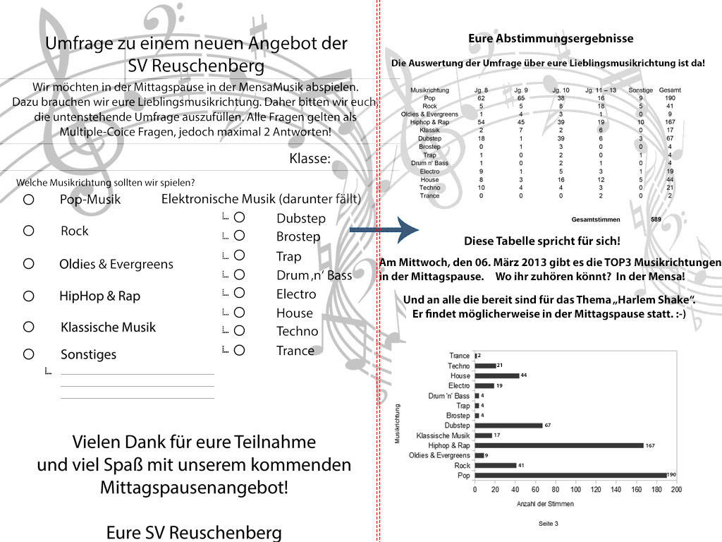 Bereits einige Tage vorher wurden die Schülerinnen und Schüler nach ihren Lieblingsmusikrichtungen befragt. Jeder konnte auf einem Umfragebogen zwei seiner Lieblingsmusikrichtungen ankreuzen.