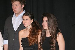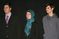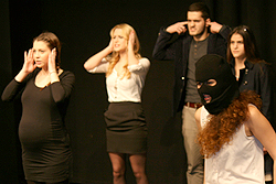 Einen spannenden Abend gestalteten unsere 121 DuG-Schüler der Jahrgänge 6 bis 10 mit Ausschnitten aus ihren aktuellen Werken. Das Repertoire reichte von Märchenhaftem über Alltagsszenen bis hin zu düsteren Visionen: Schülerinnen und Schüler des 6. Jahrgangs stellten pantomimisch mit selbst erstellten Masken Sprichwörter dar und das bekannte Märchen Aschenbrödel wurde von Schülerinnen und Schülern des 8. Jahrgangs im Schnelldurchlauf gespielt. Die “Kopflosen Schuhgeschichten” des 7. Jahrgangs zeigten, dass man verschiedene Temperamente nur an Schuhen und Gang des Trägers erkennen kann. Im imaginären “Studio 13” stellten ebenfalls Schüler des 8. Jahrgangs immer wieder die gleiche Szene dar – nach unterschiedlichen Vorgaben des unzufriedenen Regisseurs und die Schüler des 9. Jahrgangs führten uns mit ihren “Rhetorischen Begegnungen” in den Alltag Jugendliche in einem Café und einer Disco. Zuletzt spielte der DuG-Kurs des 10. Jahrgangs drei Szenen aus seinem selbst geschriebenen Stück “Suizid”, in der Eltern ob des Verhaltens ihres Nachwuchses verzweifeln.