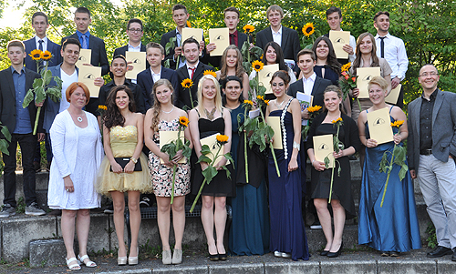 Schließlich wurde es „ernst“ und die Zeugnisse wurden überreicht. Neben den Klassenlehrern/ Klassenlehrerinnen gratulierten der Schulleiter und der Abteilungsleiter, Herr Lehmkühler, der den Abend maßgeblich vorbereitet und durch geführt hat. Jede/r Schüler/in erhielt neben vielen Glückwünschen für die Zukunft eine große Sonnenblume.